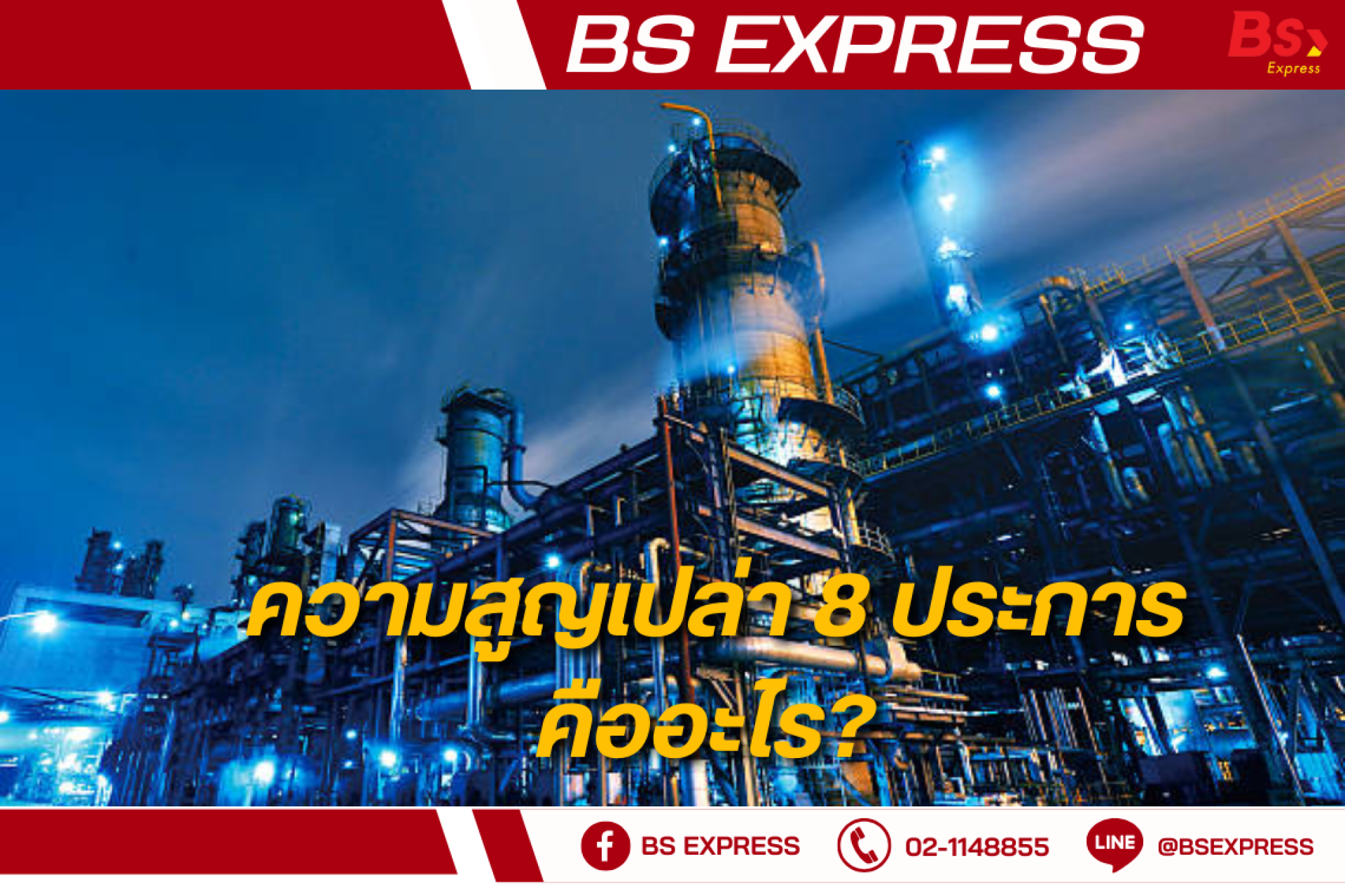 ความสูญเปล่าต่าง ๆ ในอุตสาหกรรมมีมากมายหลายรูปแบบ ปัจจุบันมีการจัดแบ่งเป็นชนิดต่าง ๆ ทั้งหมด 8 ประการดังนี้