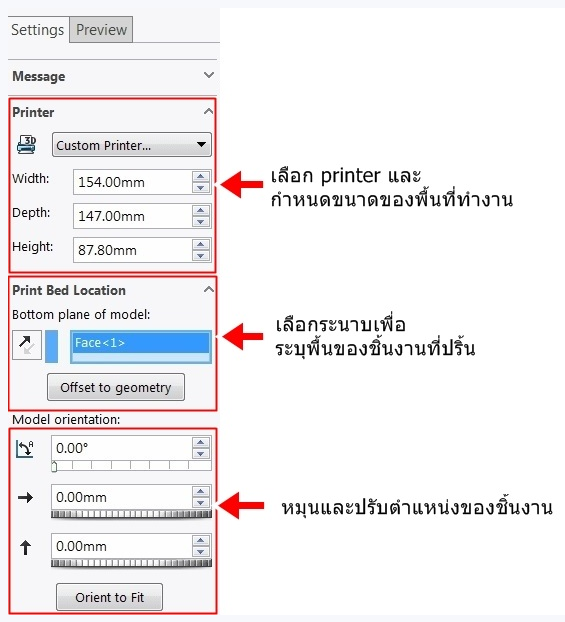 คุณสมบัติอื่นๆ ที่อาจจะต้องกำหนด นอกเหนือจากที่ได้กล่าวไว้ เช่น การกำหนด Scale ชิ้นงาน, คุณภาพของงานที่จะปริ้น, การเลือก Preview เพื่อระบุวัสดุ และความหนาของแต่ละเลเยอร์ โดยโปรแกรม SOLIDWORKS ทำการแสดงผลตัวอย่างให้ดูเมื่อความหนาแต่ละเลเยอร์มีการปรับเปลี่ยน
