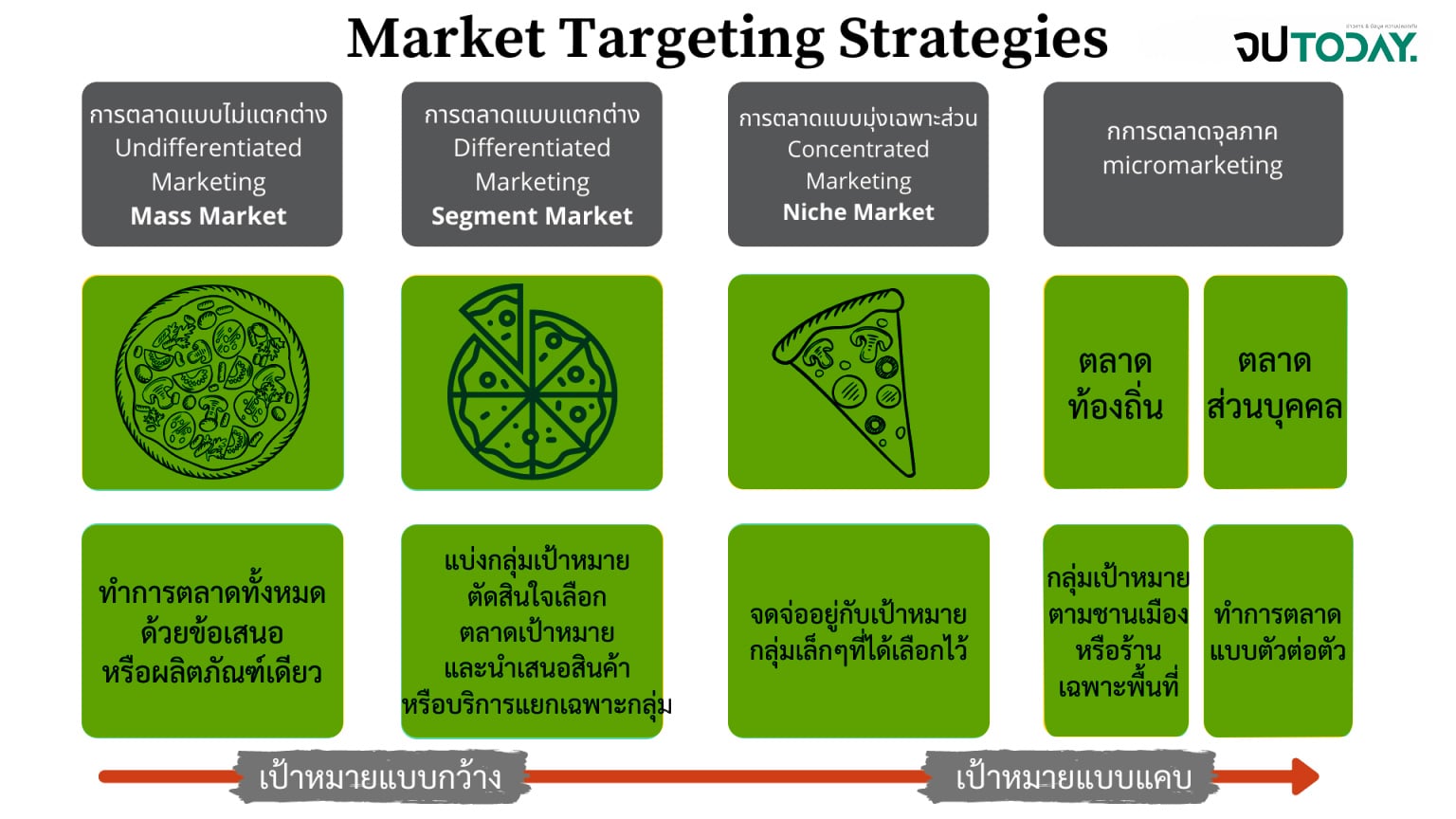 หลังจากแบ่งกลุ่มแล้ว ต้องเลือกกลุ่มเป้าหมายที่ธุรกิจจะมุ่งเน้น เพื่อให้เกิดประสิทธิภาพในการใช้ทรัพยากรและการสื่อสาร เช่น:ตลาดกว้าง (Mass Market): การขายสินค้าที่เหมาะกับทุกคน เช่น น้ำอัดลมตลาดเฉพาะกลุ่ม (Segmented Market): เน้นตอบสนองกลุ่มเป้าหมายเฉพาะ เช่น คนรักสุขภาพ