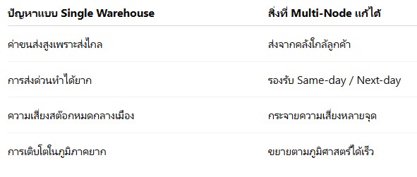 ต่างจากโมเดลแบบ Single Warehouse ที่สินค้าถูกเก็บไว้ในศูนย์เดียว การใช้ Multi-Node ช่วยให้ธุรกิจเลือกจัดส่งจากคลังที่อยู่ใกล้ลูกค้ามากที่สุด ช่วยลดระยะทางและเวลาในการขนส่งโดยตรง ส่งผลให้ลูกค้าได้รับสินค้าเร็วขึ้นและต้นทุนลดลงอย่างเห็นได้ชัด