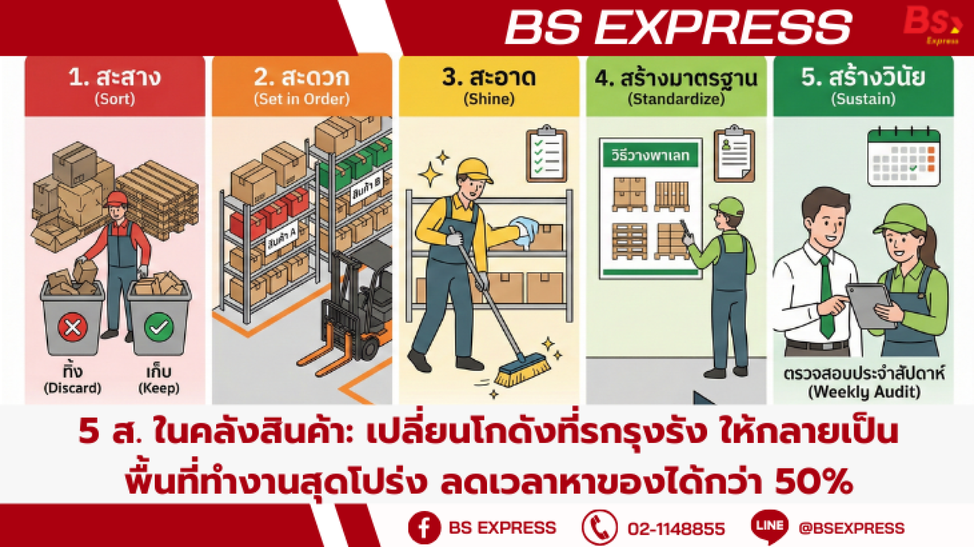โกดังรก ของหาย หาไม่เจอ! ปัญหาคลาสสิกที่ทำให้ธุรกิจสะดุด วันนี้ BS Express ขอสรุปหลักการ "5 ส." สูตรสำเร็จที่จะเปลี่ยนโกดังของคุณให้เป็นระเบียบและทำงานไวขึ้นทันทีครับ