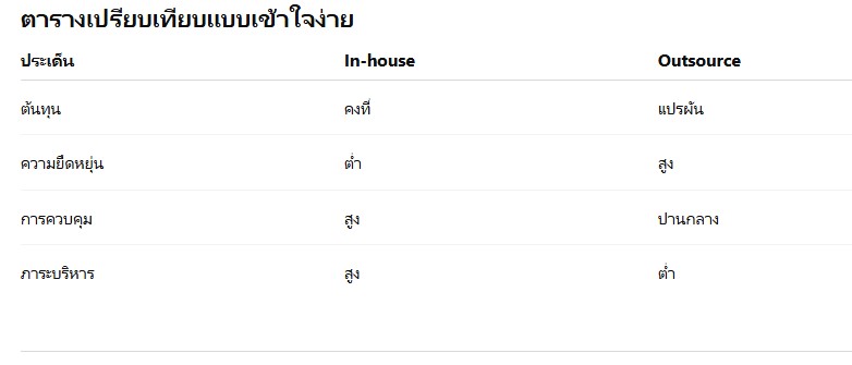 หลายบริษัทเลือกใช้ Hybrid Model คือมี In-house สำหรับงานหลัก และใช้ Outsource เสริมในช่วงพีค เพื่อควบคุมต้นทุนและคุณภาพพร้อมกัน