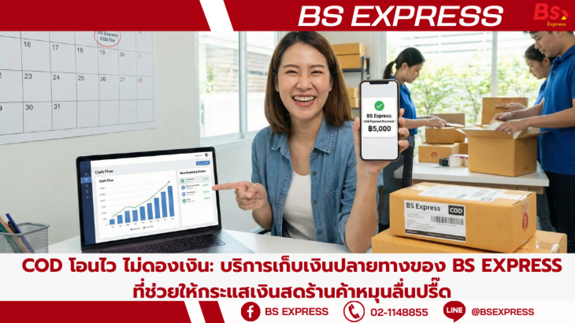 ให้ BS Express เป็นพาร์ทเนอร์ที่ช่วยดูแลทั้งการส่งของและการเก็บเงินให้คุณ ด้วยบริการ COD โอนไว ไม่ดองเงิน เพื่อให้กระแสเงินสดของคุณหมุนลื่นปรื๊ด ธุรกิจโตวันโตคืนแบบไม่มีสะดุด!