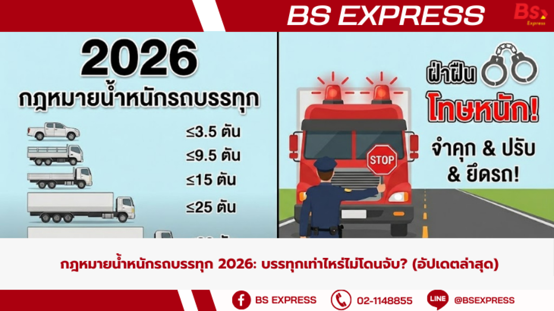 ก้าวเข้าสู่ปี 2026 อย่างเต็มตัว กรมทางหลวงเข้มงวดเรื่อง "น้ำหนักเกิน" มากขึ้น! ใครฝ่าฝืนมีสิทธิ์โดนยึดรถทันที เพื่อให้คุณขนส่งได้อย่างปลอดภัยและถูกกฎหมาย BS Express สรุปพิกัดน้ำหนักรวมสูงสุด (รถเปล่า + สินค้า) มาให้แล้ว