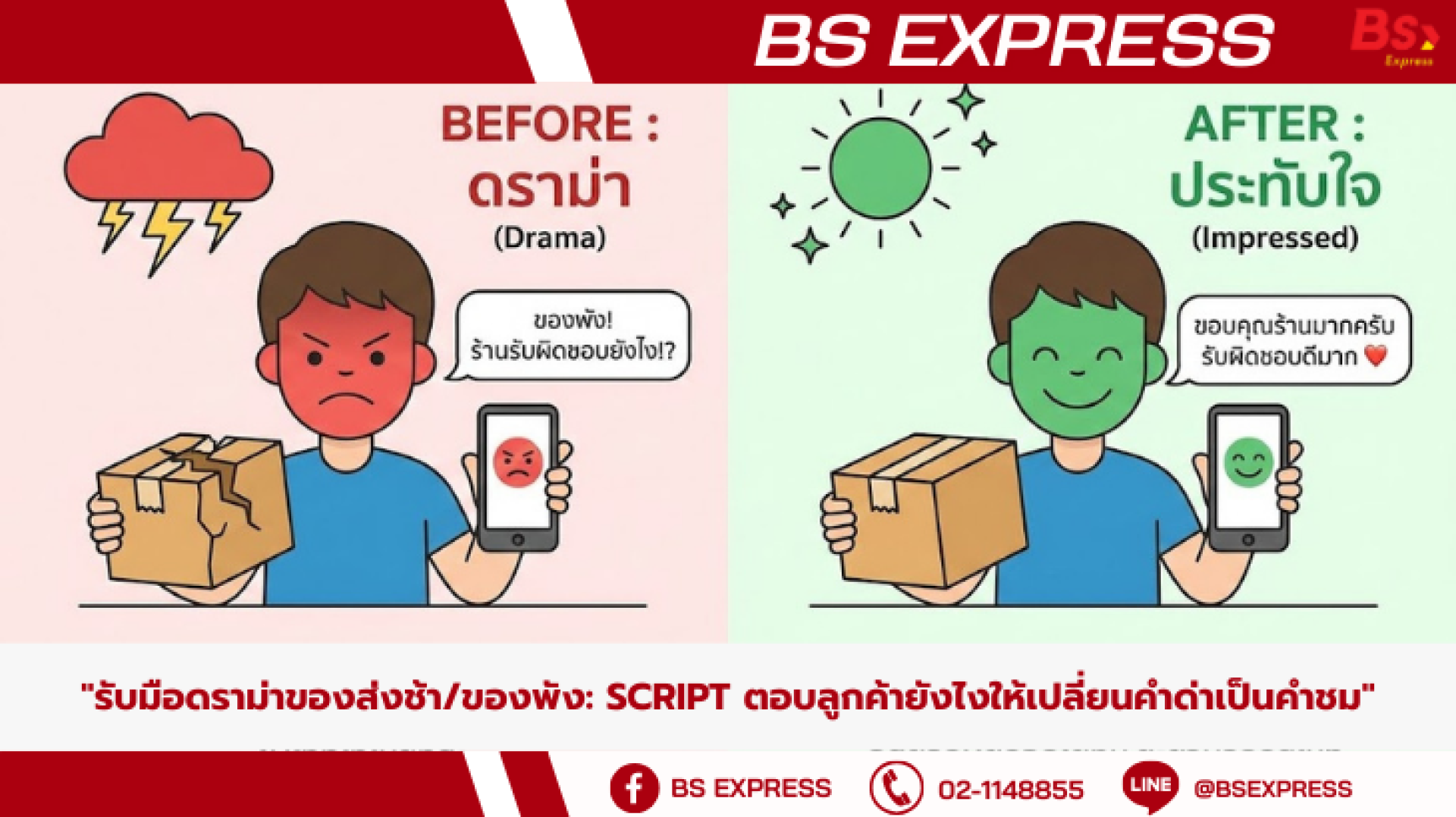 วันนี้ BS Express รวบรวมเทคนิคจิตวิทยา พร้อมแจก Script ตอบลูกค้า แบบ Copy & Paste ไปใช้ได้เลย เพื่อพลิกวิกฤตให้เป็นโอกาสค่ะ