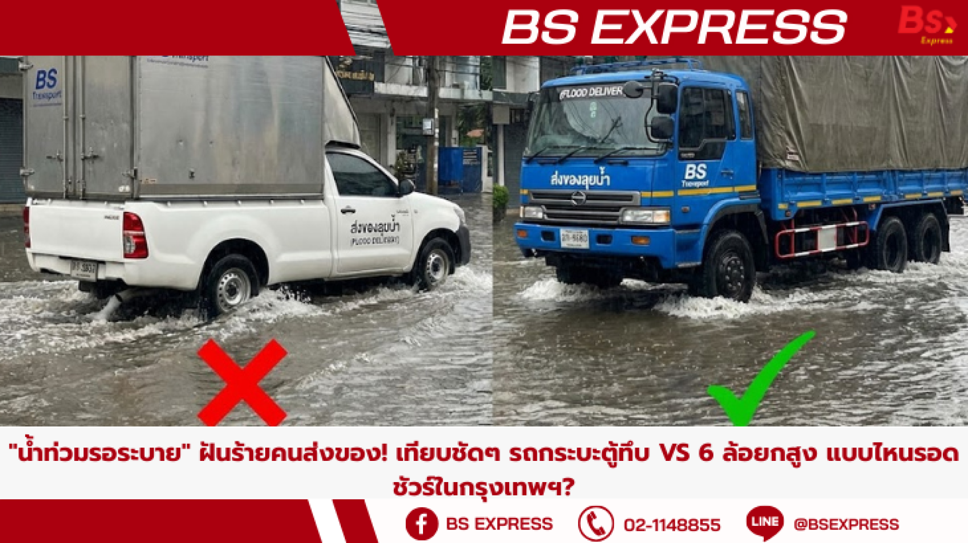 - ถ้าต้องส่งของเข้าพื้นที่ "สีแดง" (จุดเสี่ยงน้ำท่วม) หรือฝนตกหนักต่อเนื่อง -> อย่าเสี่ยง! เรียก รถ 6 ล้อยกสูง ของ BS Transport เลยครับ แพงกว่านิดหน่อยแต่แลกกับความปลอดภัยของสินค้าและความชัวร์ว่าของถึงมือลูกค้าแน่นอน "คุ้มกว่าค่าซ่อมรถ" เยอะครับ