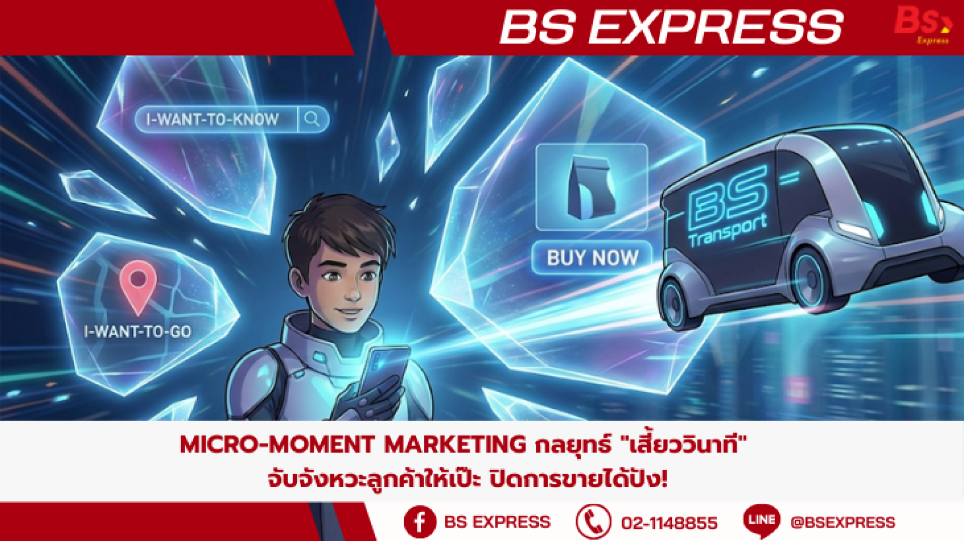 Micro-Moment Marketing คือการทำการตลาดเพื่อเอาชนะ "เสี้ยววินาที" แห่งการตัดสินใจ แต่เมื่อลูกค้าตัดสินใจ "โอนเงิน" แล้ว สิ่งที่จะสร้างความประทับใจระยะยาวคือ การได้รับสินค้าอย่างปลอดภัยและรวดเร็ว โดยเฉพาะธุรกิจ SME ที่มีการจัดส่งสินค้าขนาดใหญ่ หรือสินค้าที่มีน้ำหนักมาก การตกม้าตายตอนส่งของอาจทำให้ลูกค้าหนีหายไปตลอดกาล ให้ BS Transport เป็นผู้ช่วยรับไม้ต่อจากแผนการตลาดของคุณ เราพร้อมดูแลพัสดุทุกชิ้นด้วยความเชี่ยวชาญ เพื่อให้ลูกค้าของคุณประทับใจตั้งแต่คลิกแรกที่สั่งซื้อ จนถึงวินาทีที่เปิดกล่องครับ!