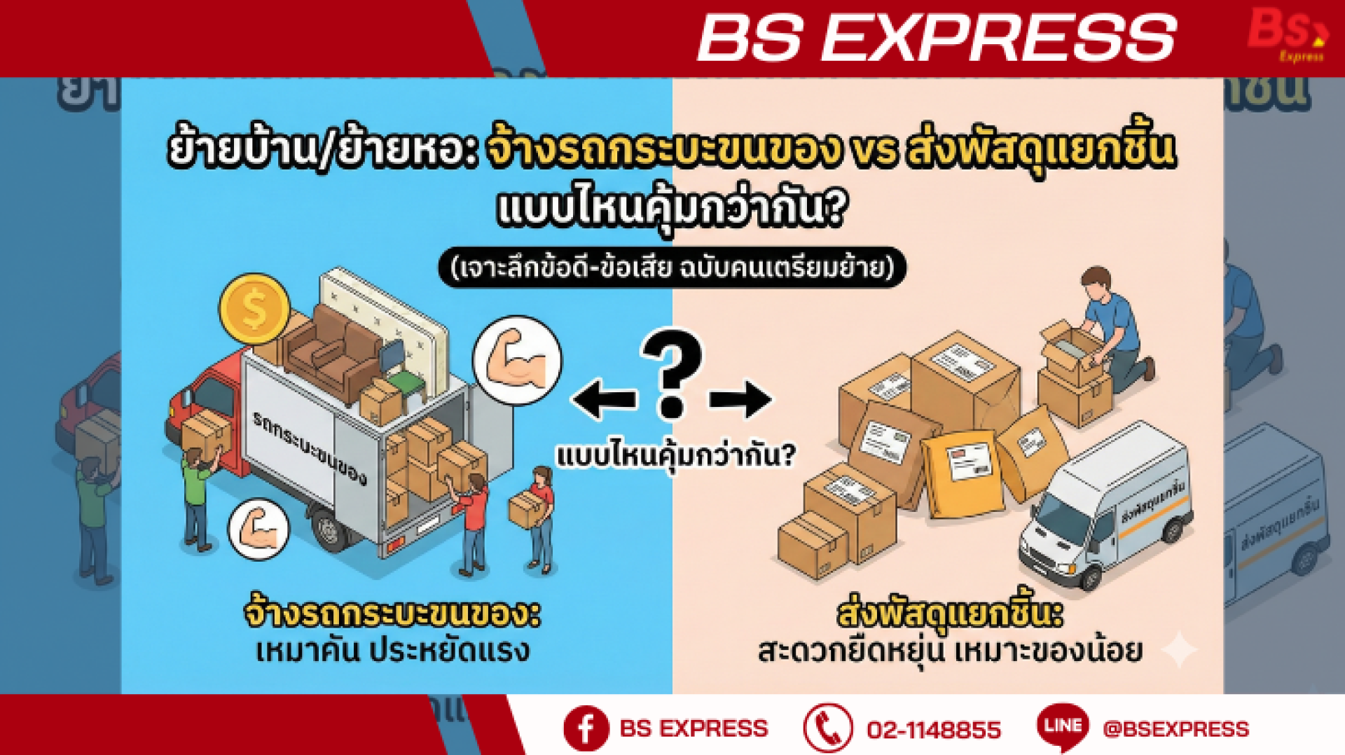 การย้ายบ้านไม่จำเป็นต้องเป็นเรื่องปวดหัวเสมอไปครับ แค่สำรวจปริมาณของตัวเองให้ดี ถ้าของน้อย เน้นคล่องตัว ให้ส่งพัสดุ แต่ ถ้าของเยอะ มีเครื่องใช้ไฟฟ้า เน้นปลอดภัย ให้เหมารถกระบะ เลือกวิธีที่ใช่ แล้วการเริ่มต้นชีวิตในที่ใหม่ของคุณจะราบรื่น ไม่มีสะดุดแน่นอนครับ!