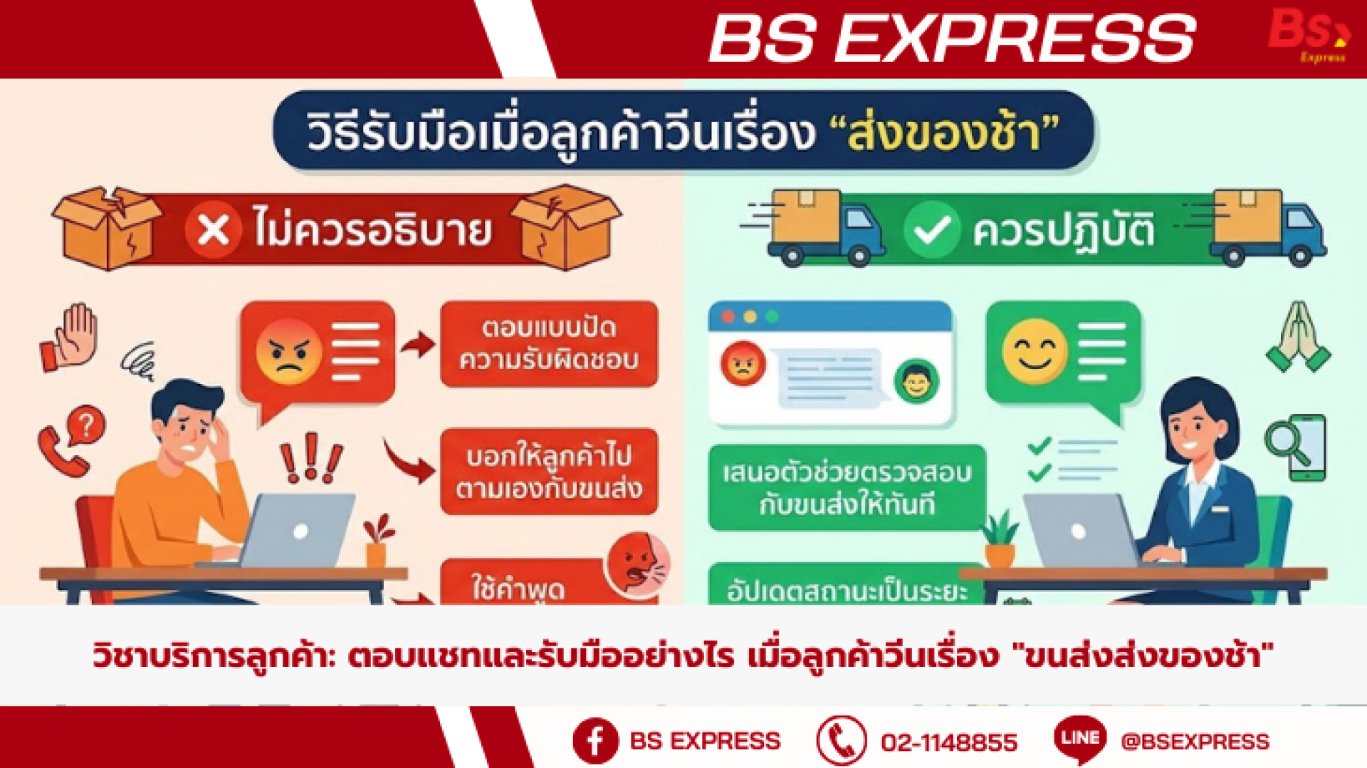 การตอบกลับด้วยอารมณ์ หรือการไล่ให้ลูกค้าไปตามเรื่องกับขนส่งเอง มีแต่จะทำให้สถานการณ์แย่ลง วันนี้ BS Express จะมาแชร์ "วิชาบริการลูกค้า" พร้อมสคริปต์ตอบแชทที่จะช่วยดับไฟโกรธ และเปลี่ยนลูกค้าที่กำลังวีน ให้กลายเป็นลูกค้าประจำค่ะ