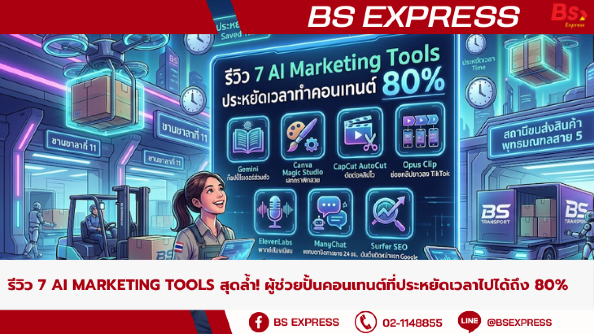 แต่ในยุคดิจิทัลแบบนี้ คุณไม่จำเป็นต้องเหนื่อยทำทุกอย่างเองอีกต่อไปครับ เพราะเทคโนโลยี AI ได้เข้ามาเป็น "ผู้ช่วยมือขวา" ที่พร้อมทำงานให้คุณตลอด 24 ชั่วโมง วันนี้ BS Transport จะขอมารีวิว 7 เครื่องมือ AI Marketing สุดปัง ที่จะช่วยเนรมิตคอนเทนต์หลักสิบให้เสร็จได้ในพริบตา ประหยัดเวลาทำงานของคุณไปได้ถึง 80%!