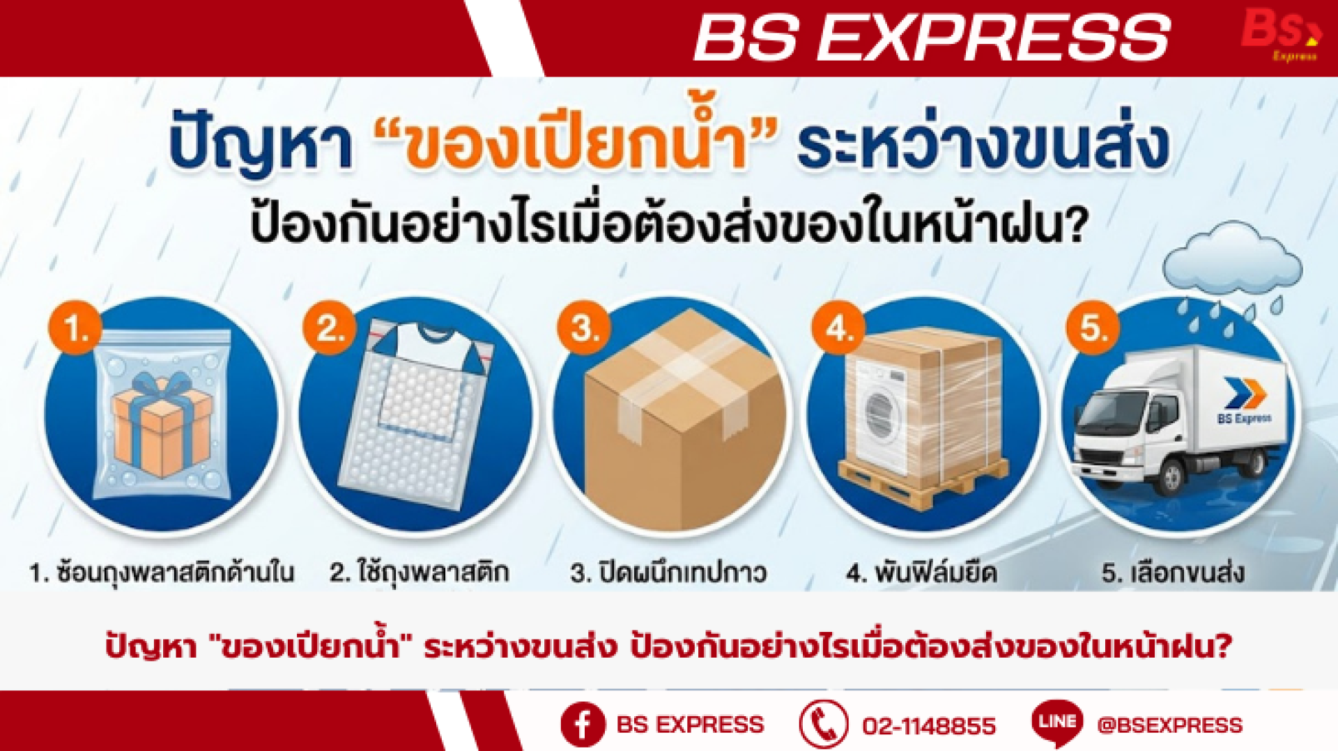 ปัญหา "ของเปียกน้ำ" นำมาซึ่งการขอเคลมสินค้า การคืนเงิน และการสูญเสียความเชื่อมั่นจากลูกค้า ซึ่งเป็นต้นทุนแฝงที่ไม่มีใครอยากจ่าย วันนี้ BS Express จะมาแชร์ 5 เทคนิคการแพ็คสินค้าให้รอดพ้นจากสายฝน การันตีว่าถึงมือลูกค้าในสภาพแห้งสนิท 100% ครับ