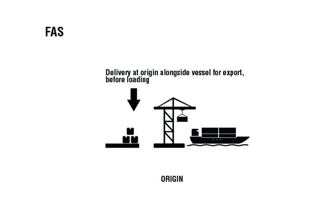 FAS หมายถึง ส่งมอบสินค้าไว้ข้างเรือโดยเสรี หมายความว่า ผู้ขายมีหน้าที่ส่งมอบสินค้าให้กับผู้ซื้อ ณ ท่าเรือที่ระบุไว้ โดยวางสินค้าไว้บนขอบท่าเรือ หรือบนเครนยกสินค้า เมื่อสินค้าถูกวางไว้ในสถานที่ที่กำหนด ถือว่าผู้ขายได้ส่งมอบสินค้าให้กับผู้ซื้อเรียบร้อยแล้ว ความเสี่ยงและความรับผิดชอบทั้งหมดของสินค้าจะโอนไปยังผู้ซื้อ ตั้งแต่จุดส่งมอบเป็นต้นไป