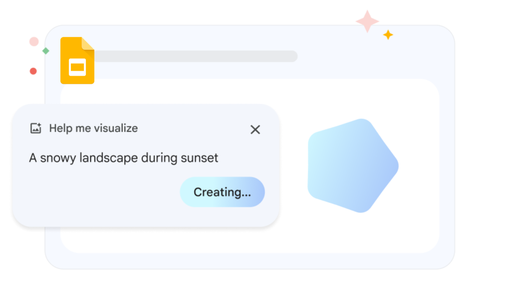 เพื่อยกระดับงานนำเสนอให้ดียิ่งขึ้น Gemini จะช่วยสร้างสรรค์รูปภาพและกราฟิกใหม่ ๆ ลงบนสไลด์ของคุณได้อย่างสวยงามและรวดเร็ว ซึ่งคุณสามารถปรับแต่งได้อย่างอิสระ