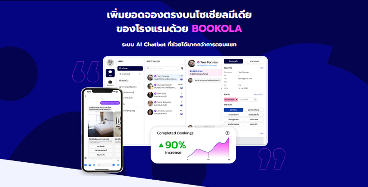 BOOKOLA คือระบบ AI Chatbot ที่ออกแบบมาเพื่อช่วยเหลือธุรกิจโรงแรมและรีสอร์ทโดยเฉพาะค่ะ โดยมีจุดมุ่งหมายหลักเพื่อเพิ่มประสิทธิภาพในการบริการลูกค้า และเพิ่มยอดขายให้กับโรงแรม