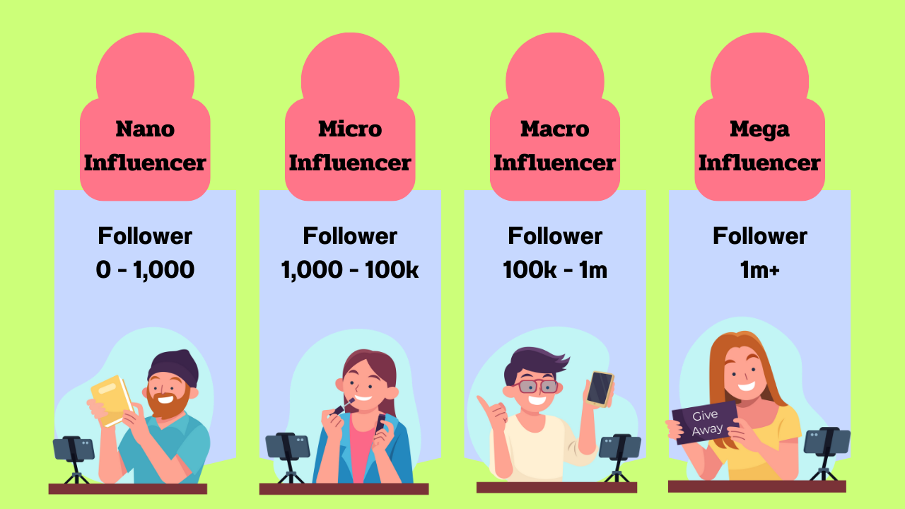 1.Mega Influencer: บุคคลที่มีผู้ติดตามมากกว่า 1 ล้านคนขึ้นไป เช่น ดารา นักร้อง นักกีฬา หรือบุคคลที่มีชื่อเสียงระดับโลก พวกเขามีอิทธิพลกว้างไกลและมักใช้ในการโปรโมทแบรนด์ใหญ่ๆ ที่ต้องการเข้าถึงผู้คนในวงกว้าง
