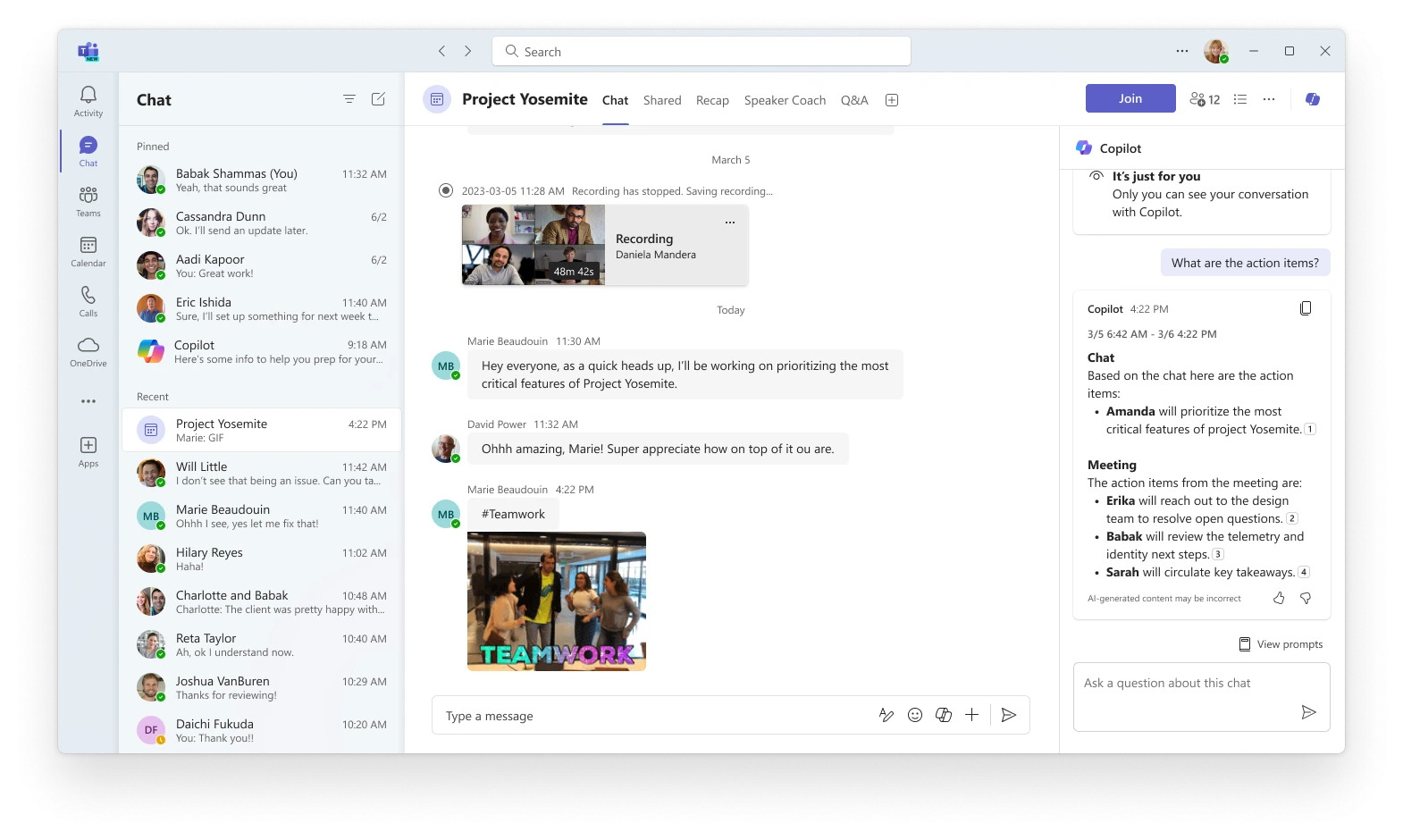 Copilot บน Microsoft Teams จะช่วยสรุปการประชุมออกมาเป็นข้อ ๆ ว่า ใครพูดอะไรบ้าง และมีความเห็นต่อเรื่องที่ประชุมอย่างไร