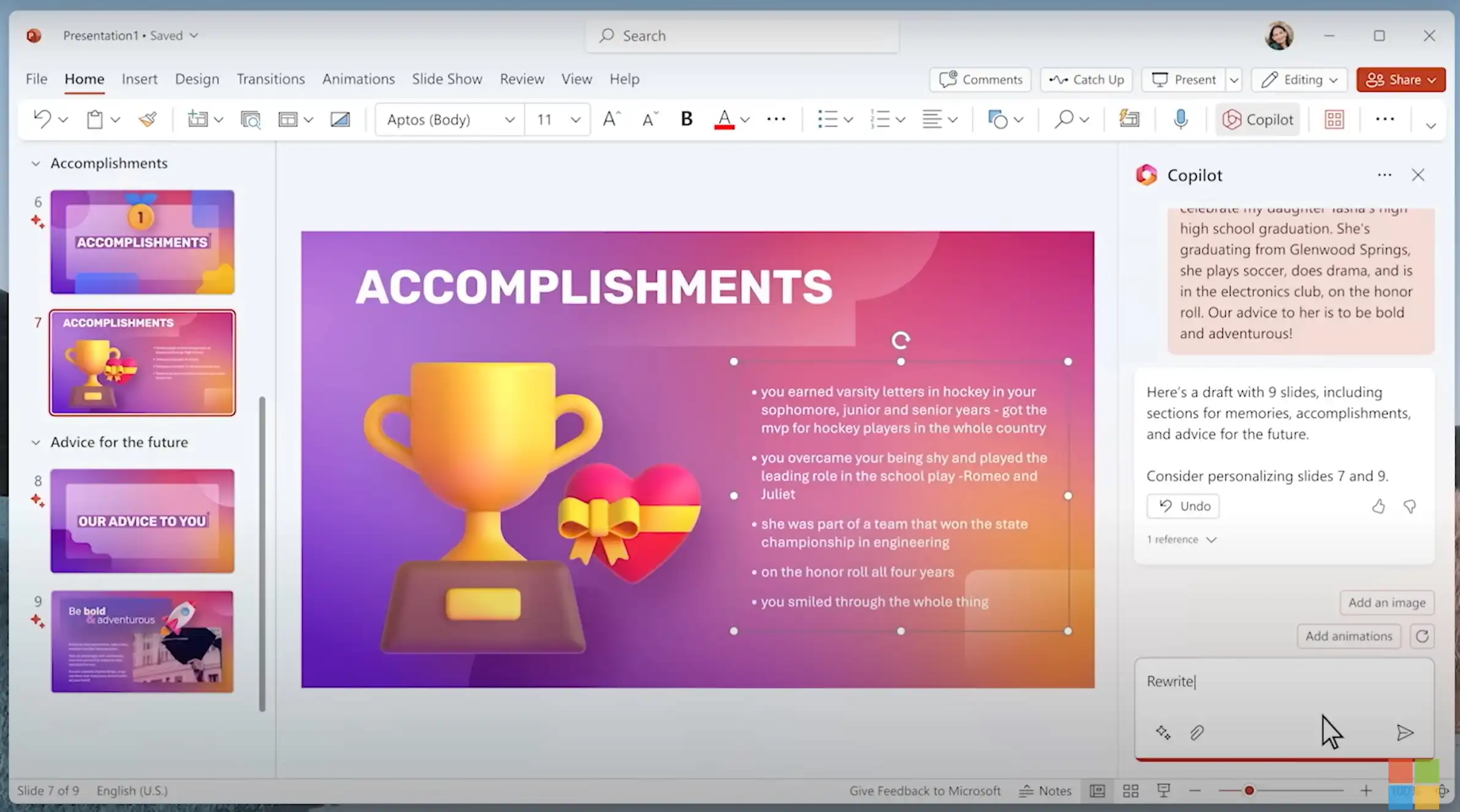 แต่ปัญหาเหล่านี้จะหมดไป เพียงสั่งให้ Copilot ช่วยทำสไลด์ ซึ่งทำเสร็จในไม่กี่นาที