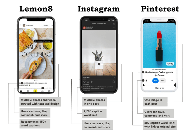 Lemon8 วางตัวเองเป็นแอปไลฟ์สไตล์ แบ่งปันรูปภาพและวิดีโอ ที่ผสมผสานการใช้งานแบบ Instagram และ Pinterest สำหรับครีเอทีฟรุ่นเยาว์ไว้สร้างคอนเทนต์ แบ่งปันเนื้อหาที่หลากหลาย มีตั้งแต่แฟชั่น การแต่งหน้า อาหาร การท่องเที่ยว ของใช้ในบ้าน สัตว์เลี้ยง การงาน การวางแผนทางการเงิน หารายได้พิเศษ รีวิว บอกต่อ เรียกว่าเป็น คอมมูนิตี้ของวัยรุ่น อย่างเต็มรูปแบบ