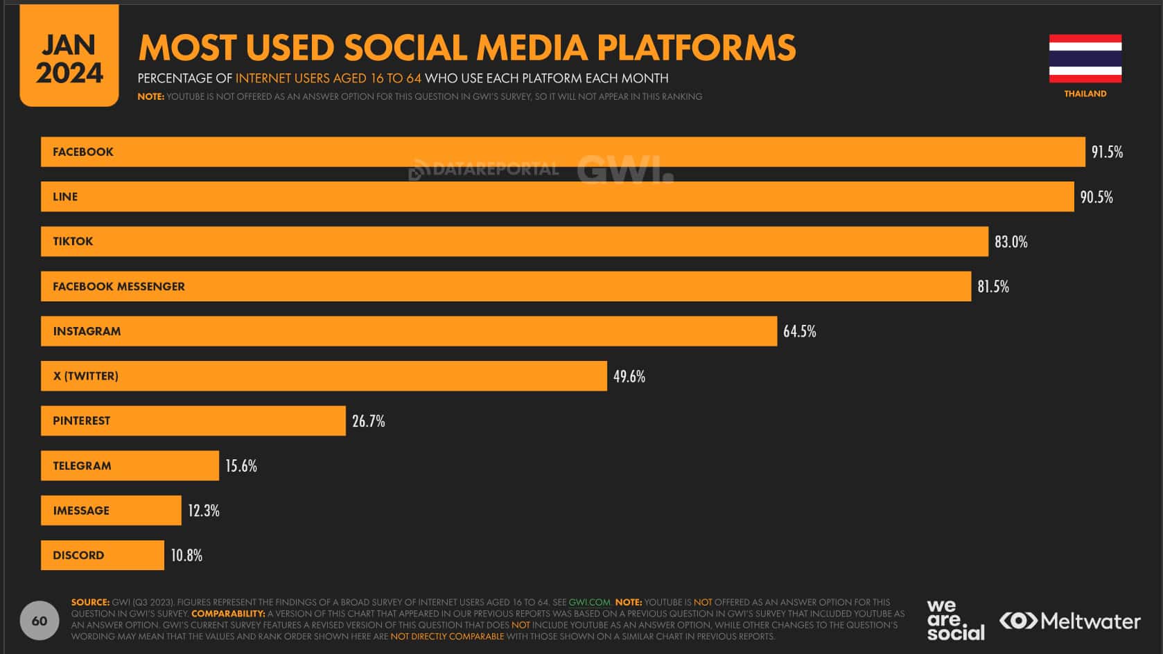 Social Media ที่คนไทยนิยมมากที่สุดยังคงเป็น Facebook ซึ่งคิดเป็น 91.5% ของประชากรกลุ่มตัวอย่างอายุระหว่าง 16-64 ปี รองลงมาคือ LINE คิดเป็น 90.5% และ TikTok คิดเป็น 80.3%