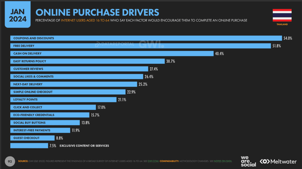 แม้ข้อมูลนี้จะไม่ใช่สถิติ Facebook โดยตรง แต่ก็เป็นแหล่งอ้างอิงชั้นดีสำหรับผู้ที่กำลังทำ Facebook Marketing โดยเฉพาะอย่างยิ่งเหล่าร้านค้าออนไลน์ที่เปิดรับออเดอร์ผ่าน Facebook โดยข้อมูลจาก We Are Social ระบุว่า ปัจจัยที่มีผลต่อการซื้อของผู้บริโภคชาวไทย อันดับ 1 คือคูปองส่วนลด คิดเป็น 54% รองลงมาคือ โปรโมชันส่งฟรี คิดเป็น 51.8% และฟีเจอร์เก็บเงินปลายทาง คิดเป็น 40.4%