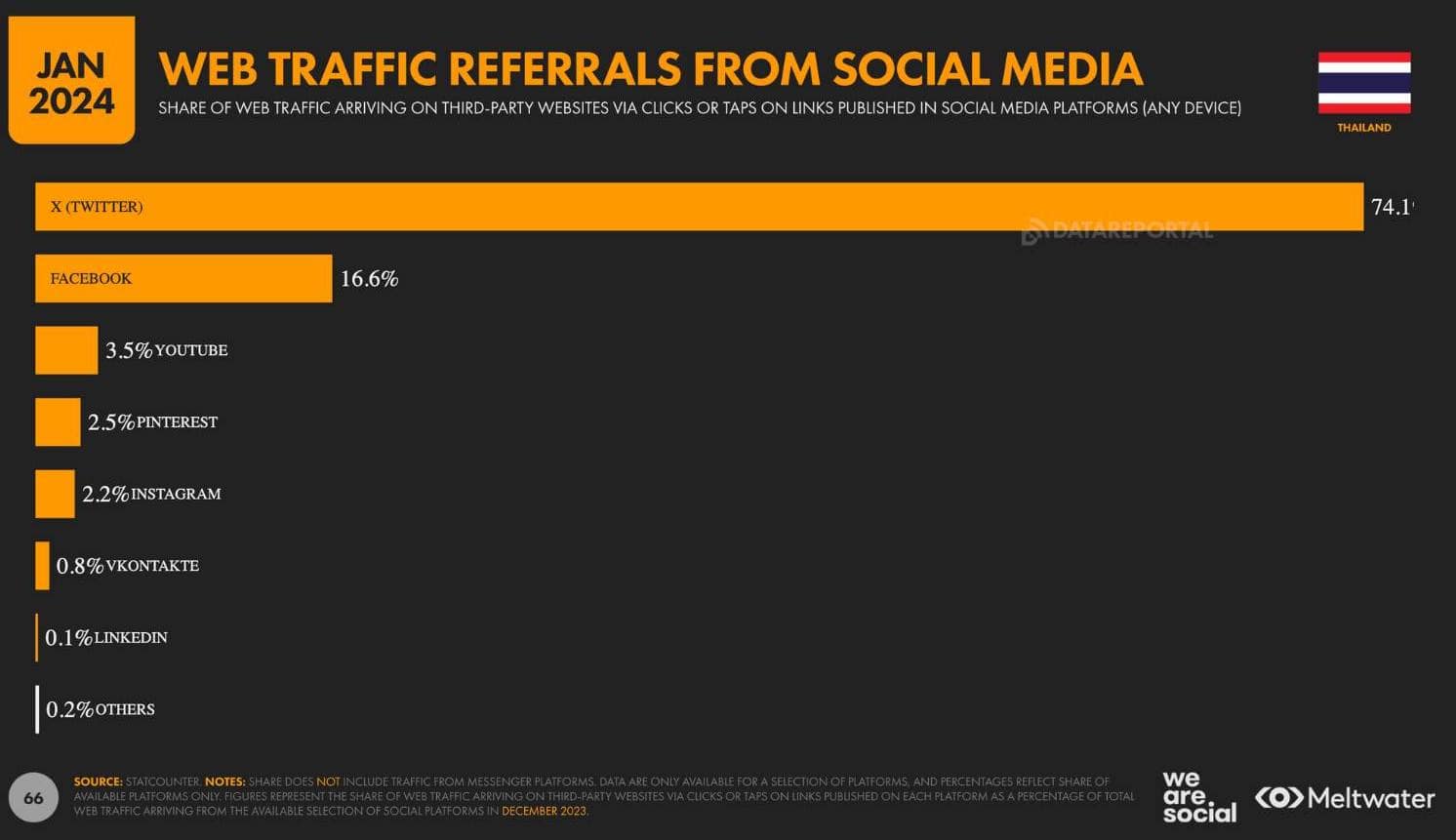 5. Facebook คือ Social Media ที่ส่ง Traffic ไปยังเว็บไซต์มากเป็นอับดับ 2 ส่วนX (Twitter เดิม) ครองแชมป์