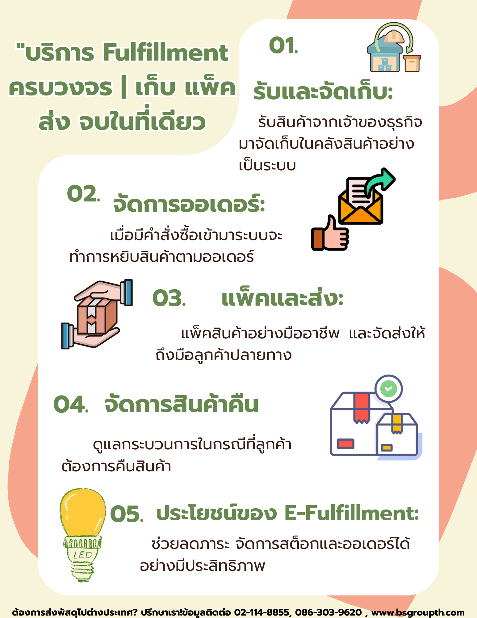 ซึ่งทั้งหมดนี้... E-Fulfillment จัดการให้คุณได้แบบครบวงจร! เปลี่ยนความวุ่นวายให้เป็นระบบ แล้วเอาเวลาไปคิดโปรโมชั่นเด็ดๆ ดีกว่า!